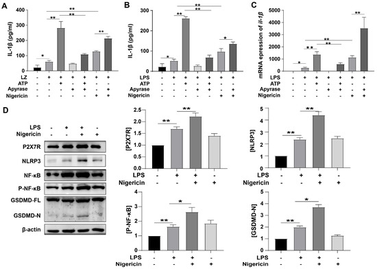 Physiological roles for GSDMD in both pyroptosis and IL-1β release during inflammasome signaling have been extensively characterized in macrophages and other mononuclear leukocytes. Assembly of N-GSDMD pores in the plasma membrane markedly increases its permeability to macromolecules, metabolites, ions, and major osmolytes, resulting in the rapid collapse of cellular integrity to facilitate pyroptosis [29]. As well, in this study, LPS treatment prominently increased the expression of N-GSDMD (** p < 0.01) (Figure 2D), Nigericin further increased the expression of N-GSDMD (* p < 0.05) which meant that pyroptosis was activated. All these results suggested that ATP-induced pyroptosis was through ATP/P2X7R pathway.