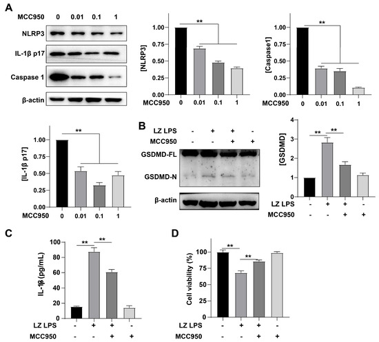 To better verify the role of the formation of inflammation in cell death, MCC950 (a potent and specific inhibitor of the NLRP3 inflammasome) was utilized in this study. First, we treated cells with different concentrations of MCC950, then observed the expression of NLRP3. Compared with the LPS group, MCC950 markedly reduced the expression of NLRP3 in a concentration-dependent manner (** p < 0.01) (Figure 4A). We also detected the expression of caspase 1, showing the same rule (Figure 4A). Subsequently, we tested the level of GSDMD. Compared with the LPS group, MCC950 could significantly reduce the expression of GSDMD (** p < 0.01) (Figure 4B). Then we tested the content of IL-1β in the culture medium by ELISA, and found that MCC950 also significantly reduced the secretion of IL-1β (** p < 0.01) (Figure 4C). Finally, the cell survival rate was measured by CCK8, and data showed MCC950 could significantly reduce the cell mortality rate that was increased by LPS (** p < 0.01). These results suggested that the formation of inflammasome bodies plays a key role in G. parasuis infection.