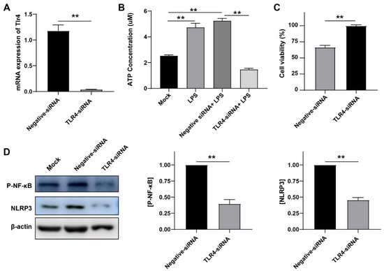 Toll-like receptor 4 (TLR4), acting as a receptor for LPS, has a pivotal role in the regulation of immune responses to infection [21]. The binding of LPS to TLR4 leads to the activation of NF-κB which plays a crucial role in regulating the transcription of genes related to innate immunity and inflammation responses in the lungs and in monocytes [22]. To prove that TLR4 plays an important role in G. parasuis infection, we used miRNA silencing technology to verify it. First, we tested the silence efficiency of siRNA and found that the siRNA significantly reduced the mRNA level of TLR4 (** p < 0.01), meaning that this siRNA worked well (Figure 5A). Then we observed the effect of TLR4 on ATP levels. Compared with the negative control group, we found that after silencing TLR4, ATP level decreased significantly (** p < 0.01) (Figure 5B). In addition, silencing TLR4 significantly restored cell death caused by LPS (** p < 0.01) (Figure 5C). Then, we detected the influence of TLR4 on the downstream inflammatory pathway, and found that the expressions of p-NF-κB and NLRP3 decreased, and TLR4 knockout decreased the activation of the NLRP3 inflammasome (** p < 0.01) (Figure 5D). These data evidently suggest that LPS induced inflammation in a TLR4-dependent manner.
