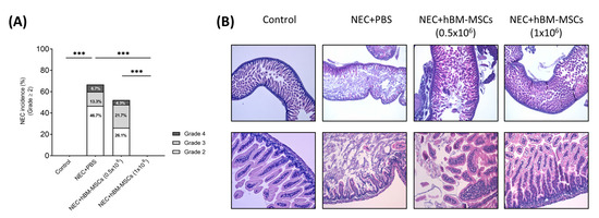 3.2. Treatment with hBM-MSCs Decreases the Incidence and Severity of Experimental NEC in a Concentration-Dependent Fashion in Neonatal Mice
