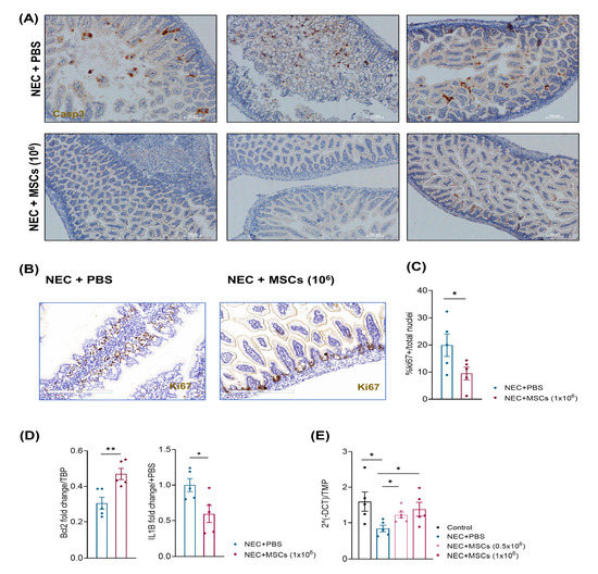 3.3. hBM-MSCs Reduced Apoptosis and Stimulated Tissue Regeneration in a Neonatal Mouse NEC Model