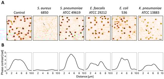 Distinct cell morphologies after exposure to bacterial culture supernatant derived from different species. Human primary T-cells were treated with sterile bacterial culture supernatants derived from various species or left untreated as control. DHM was applied to visualize morphological changes. Representative images illustrating the cell morphology 10 h after the addition of supernatants are shown. (A) Pseudo-colored phase contrast images. The scale corresponds to 10 µm. (B) Distribution of phase contrast of cross-sections through single cells (black dashed line in A).