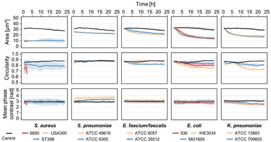 T-cell response to bacterial culture supernatant depends on both the species and strain. Human primary T-cells were exposed to sterile bacterial culture supernatants from various species and strains (colored lines) or left untreated as control (black lines). Timelapse DHM was applied to monitor the cellular response over time, and the resulting quantitative phase contrast images were analyzed for average single cell area, average circularity and mean phase contrast per cell. Results are presented as mean (solid lines) ± SD (shading) of at least three independent experiments. The curves were smoothed using moving averages with a window size of 15 measuring points.