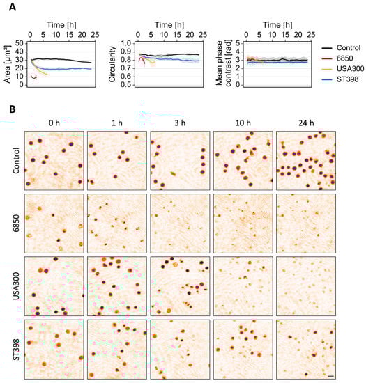 In addition to soluble virulence factors, bacteria release MVs during their normal growth that contain a range of biological cargo including nucleic acids, proteins, enzymes and toxins. MVs can stimulate the innate as well as the adaptive immune response, thereby contributing to pathogenesis within the host [46]. We therefore exposed T-cells to bacterial MVs and monitored changes in single-cell area, circularity and mean phase contrast with timelapse DHM. Only MVs derived from S. aureus induced a cellular response (Figure 3). Pseudo-colored phase contrast images clearly show a loss of cell integrity (Figure 3B). This observation is quantified by a decrease in single cell area and circularity score (Figure 3A). In line with the supernatant treatment, the intensity of the cellular response to MVs varied between the different strains. S. aureus strain 6850- and USA300-derived MVs induced the most rapid and strongest effects with lysis of the cells after 3 and 7 h, respectively (Figure 3). In contrast, we did not observe any effects on cell morphology when T-cells were treated with MVs derived from S. pneumoniae, E. faecium, E. faecalis, E. coli or K. pneumoniae (Figure S2).