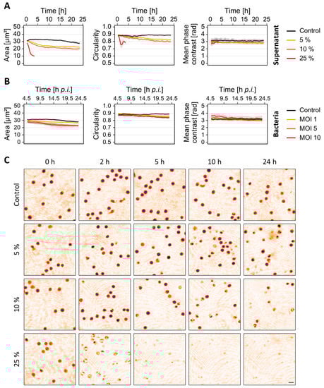 It was shown that alterations of neutrophil morphology and motility in sepsis patients correlate with disease severity [9]. Thus, we hypothesized that the T-cell response to living bacteria or bacterial virulence factors might also be concentration-dependent. To test this hypothesis, T-cells were treated with different concentrations of sterile culture supernatant (Figure 4A,C) or were infected with increasing MOIs of living S. aureus strain 6850 (Figure 4B). The cellular response to sterile culture supernatant was considerably stronger compared to live bacteria. Even at low supernatant concentrations of 5% (v/v), T-cell area as well as circularity were rapidly reduced, and increasing the concentration enhanced this effect (Figure 4A). After infection with living bacteria, cell area and circularity also decreased but to a lesser extent (Figure 4B). In line with the previous results, these changes were also concentration-dependent, and a higher bacterial load led to a stronger T-cell response.