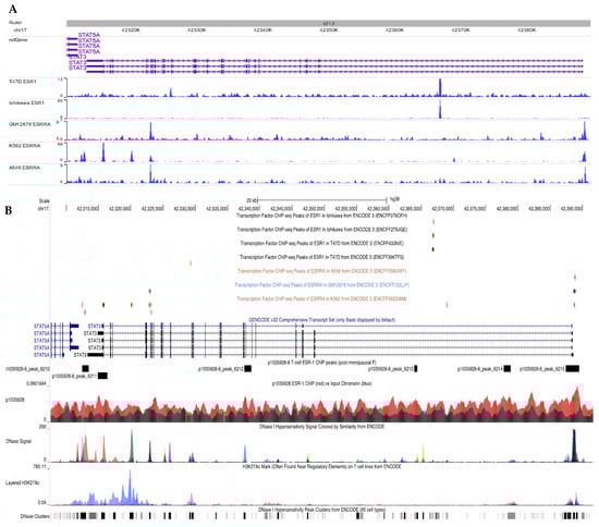 Genomic visualization of ESR1 or ESRRA binding activity at the STAT3 gene locus. (A) Gene annotations indicate the position of STAT3, its exons (thick bars) and introns (connecting arrows showing the direction of translation). Blue tracks indicate the enrichment of the ChIP-seq signal for ESR1 or ESRRA binding over the background input for five cell lines. Sharp, prominent peaks provide evidence for the ability of these transcription factors to bind STAT3, demonstrating their interaction in these cell types. (B) Track visualization of ERα ChIP-seq for the STAT3 locus. Primary CD4+ T-cell ERα ChIP enrichment signal (red) is depicted against the input chromatin signal (black). Rectangular regions above the ChIP track indicate regions significantly enriched with ERα binding. Top: Additional tracks indicate positions of ESR1 or ESRRA binding activity in ChIP-seq data from the ENCODE project. Note that ERα binding events are not typically shared from experiment to experiment, even when cell lines are identical. Bottom: DNase and H3K27ac signal from the ENCODE project, indicating regions of strong enhancer activity in general cell lines. ERα-binding regions in T-cells occur in areas with known chromatin accessibility.