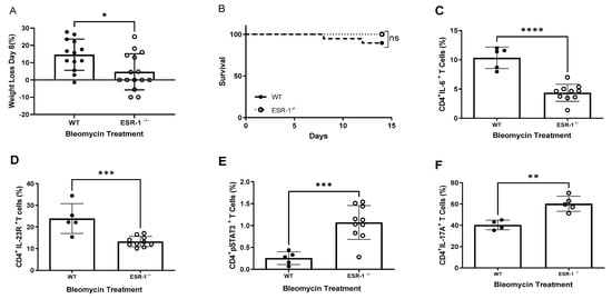 Loss of estrogen receptor alpha subunit (ESR-1) improves survival and ameliorates fibrosis in female mice. WT and ESR-/- mice were treated with bleomycin and monitored for 14 days. (A) Body weights of mice at day 8 compared to day 0; (B) Murine mortality across 14 days. Kaplan–Meier survival analysis with a log-rank test was used to determine differences between groups. Flow cytometric analysis of T cells from single-cell lung suspensions at day 14 for (C) IL-6, (D) IL-23R, (E) pSTAT3Y705 and (F) IL-17A. Comparisons between cohorts were performed using one-way ANOVA with Tukey’s post hoc test. * p < 0.05, ** p < 0.01, *** p < 0.001; **** p < 0.0001; ns: no significance. Bars are the mean ± SD; each symbol represents an individual mouse. WT: Wild-type, ESR-1-/- estrogen receptor alpha knockout mice. N = 4–15.
