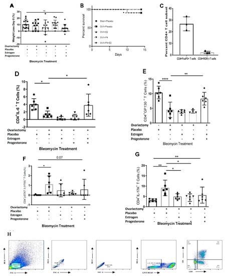 To further delineate the contribution of female gonadotrophic hormonal signaling to the progression of proinflammatory cytokine expression in the lung, we used female C57BL/6J mice that were ovariectomized or sham-operated at three weeks of age. Slow-release pellets containing either 17β-estradiol (17β-E2, 0.1 mg), progesterone (P4, 25 mg), the combination of 17β-E2 (0.1 mg) and P4 (25 mg) or a vehicle (25.1 mg) were subcutaneously implanted into adult ovariectomized female C57BL/6J mice at six weeks of age. At nine weeks of age, all groups were challenged with bleomycin, and the lungs were harvested 14 days later. There was no significant difference in weight loss or survival across the hormone treatment groups compared to the ovariectomized mice implanted with placebo pellets (Figure 3A,B).