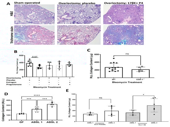Quantification of bleomycin-induced pulmonary collagen with various hormone deletion or repletion conditions in distinct housing environments. (A) Representative H&E and trichrome histologic stains of lungs at day 14 under various hormone conditions; (B) Pulmonary collagen quantification of the lung under baseline, hormone depletion and hormone repletion conditions. (C) Pulmonary collagen quantification of the lung under wild-type (WT) and ESR1 null conditions; (D) Pulmonary collagen quantification in menstruating female mice housed in germ-free, ABSL-1 and ABSL-2 environments; (E) Pulmonary collagen quantification of ovariectomized and estrogen-repleted mice in ABSL-1 and ABSL-2 environments. Comparisons between cohorts were performed using one-way ANOVA with Tukey’s post hoc test. * p < 0.05, *** p< 0.001, **** p < 0.0001. ns: no significance; RLL: right lower lobe. Bars are the mean ± SD; each dot represents an individual mouse. N = 5–14.
