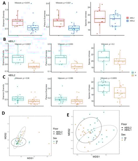 Murine female gut microbial diversity is modified by housing environment. (A) Shannon diversity index, Pielou’s evenness and species richness scores for female mice housed in ABSL-1 and ABSL-2 facilities following bleomycin inoculation (N= 9–14 mice per cohort). The boxes show the median, as well as the 25th and 75th quartiles. The whiskers extend to 1.5*IQR. Each dot represents one mouse. (B,C) Comparison of female and male Shannon diversity index, Pielou’s evenness and species richness scores for female mice housed in ABSL-1 and ABSL-2 facilities following bleomycin inoculation (n =14–16 mice per cohort). (D) Nonlinear multidimensional scaling (MDS) plot showing differences in microbial taxonomic composition based on Jaccard dissimilarities. (E) Nonmetric multidimensional scaling plot based on Bray–Curtis and Jaccard dissimilarities showing the gut microbiome by gender of murine communities housed on ABSL1 and ABSL2 floors.