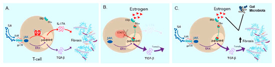 Independent reports demonstrate that profibrotic signaling pathways converge on STAT3, an important molecular checkpoint for tissue fibrosis [12,13]. Immune cells, including CD4+ T cells, produce IL-6, which enhances collagen production through the induction of JAK/STAT3/IL-17A or JAK/ERK/TGF-β1 signaling in local and systemic environments [14,15,16,17]. Distinctions in clinical outcomes by sex support an investigation of the interplay of female gonadotrophic hormones with the STAT3-dependent induction of profibrotic cytokine expression. The interactions of the alpha subunit of the estrogen receptor (ERα) and STAT3 protein, both transcription factors, have been reported in breast cancers of epithelial origin, noting enhanced epithelial–mesenchymal transition (EMT) as well as augmented tumor metastasis [18]. However, the immunologic consequences of ERα binding to the STAT3 gene in CD4+ T cells of patients with lung fibrosis remain unexplored.