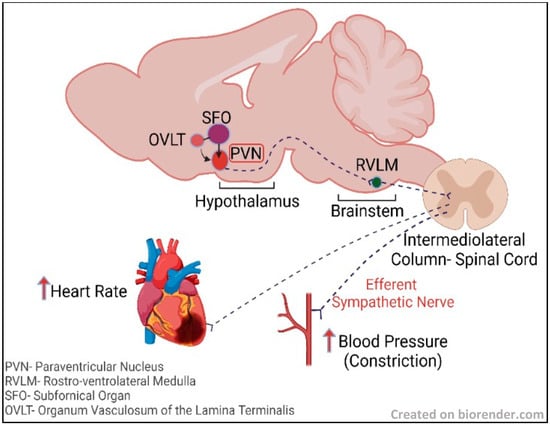 A simplified pathway showing excitatory circulatory signaling from SFO and OVLT, which are circumventricular organs lacking blood brain barrier, passing to the adjacent PVN in the hypothalamus and RVLM in the brainstem, causing an efferent sympathetic nerve response from the intermediolateral column of the spinal cord to the heart and blood vessels, resulting in increased heart rate and increased blood pressure associated with vasoconstriction.