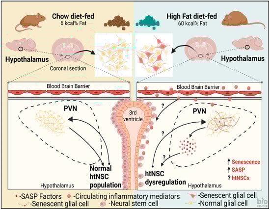 Cellular senescence is an irreversible growth arrest in proliferating cells, which has been implicated in several neurodegenerative diseases [,]. During the process of senescence, the NSCs lose their ability to proliferate and generate neurons [,,,]. Supplementing mono-unsaturated fatty acids, such as oleic acid, in the diet caused lipid droplets to develop in ependymal cells and contributed to a decrease in neurogenesis in SVZ in the Alzheimer’s disease mouse model, 3xTg-AD []. Likewise in obesity, SVZ showed an increase in senescent glial cells carrying excessive fat deposits, and genetically ablating these senescent glial cells restored neurogenesis []. Thus, modifying the lipid content in the diet can replenish the old neurogenic pool. In this review, we will summarize hypothalamic neurogenesis associated with obesity and aging and explore the possibilities of NSC-based regenerative therapy to treat obesity-induced cardiovascular conditions.