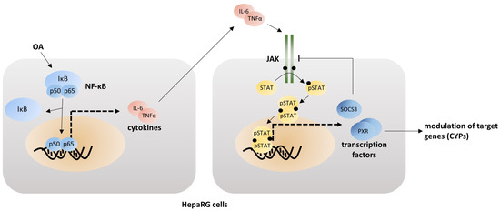 In this study, we provide an advanced characterization of the OA-mediated inflammatory response. We propose an activation pathway involving NF-κB and JAK/STAT signaling (cp. Figure 1) and determine if OA is able to activate the JAK/STAT signaling pathway in HepaRG cells through activation of NF-κB and if activation of the pathway is connected to CYP downregulation.