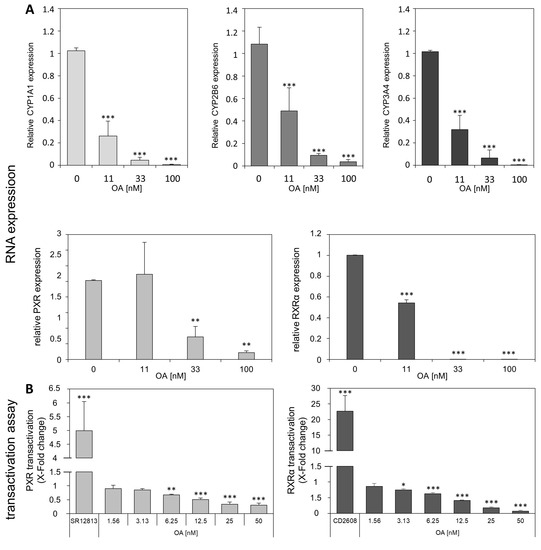 Firstly, we evaluated the expression and transcriptional activity of PXR and RXRα, two transcription factors regulating CYP expression. Both endpoints were significantly downregulated upon exposure of cells to OA. We postulated a possible mechanism as underlying signaling pathway for the altered expression of xenobiotic-metabolizing enzymes (Figure 1).