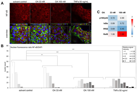 Activation of NF-κB in HepaRG cells. Differentiated HepaRG cells were treated with 33 and 100 nM OA alone or 33 µM OA in combination with 30 µM JSH-23, or 30 µM Methysticin, two NF-κB activation inhibitors, or with the respective solvent control for 24 h. (A): Nuclei were stained with DAPI, and the actin cytoskeleton was stained using ActinGreen™ 488 ReadyProbes™ reagent. Immunostaining of NF-κB was carried out using a primary antibody against NF-κB subunit p65 and stained using a secondary antibody conjugated with the fluorophore Alexa Fluor™ 633. Fluorescence was detected using a confocal laser scanning microscope at ex wavelengths of 405 nm (DAPI, blue), 488 nm (ActinGreen, green), and 633 nm (NF-κB, red). Z-stacks spanning through the entire cell layer were recorded at 63× magnification. Brightness was increased by 15% for the green channel, 60% for the blue channel, and 70% for the red channel in each image. (B): The nuclear fluorescence ratio was determined using ImageJ 1.53e. Nuclei were marked as ROI and the fluorescence intensity of the red and blue channels in each ROI was determined separately. A ratio of NF-κB/DAPI signal intensity was then calculated and normalized to the mean of the solvent controls. The nuclei were divided into groups based on their signal intensity. Results show the number of nuclei per signal intensity group for each treatment group. Between 65 and 99 nuclei were evaluated per condition. Statistical analysis was performed using Wilcoxon rank-sum test (** p < 0.01; *** p < 0.001). (C): Results of the DigiWest analysis for p100/p52, IκBα, IKKβ, and RelB. Results were obtained using 3 pooled replicates.