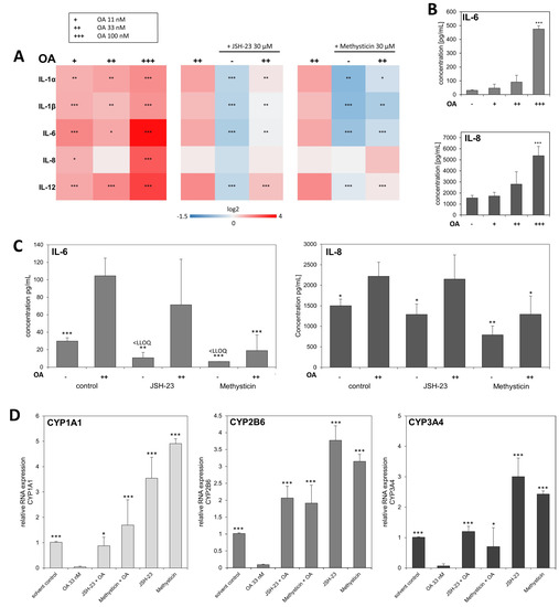Activation of NF-κB leads to expression and release of cytokines. We were able to show that the mRNA expression of several interleukins was upregulated in HepaRG cells upon exposure to OA. To show a direct involvement of NF-κB activation through OA with these effects, we then added NF-κB inhibitors. The NF-κB inhibitors were able to reverse the observed effect of OA on the ILs (Figure 4A). This suggests an involvement of NF-κB signaling in IL mRNA expression. To verify the effects of OA on the RNA expression of ILs in HepaRG cells, we then investigated the protein expression of IL-6 and IL-8 using Luminex xMAP® technology. Figure 4B shows the release of IL-6 and IL-8 into the cell culture supernatant. IL-1α, IL-1β, IL-12, and TNF-α were also analyzed. Results for IL-1α can be found in the supplementary material (Figure S4), while the levels of the other cytokines did not exceed the LLOQ (IL-1β: 2.76 pg/mL; IL-12: 7.74 pg/mL; TNFα: 6.15 pg/mL). OA exposure clearly led to a concentration-dependent release of cytokines from HepaRG cells. Furthermore, combined incubation with OA and the NF-κB inhibitor Methysticin was able to counteract the cytokine release induced by OA, which is shown in Figure 4C. Results of cytokine release after incubation with JAK inhibitors can also be found in the supplementary material (Figure S3). The addition of NF-κB inhibitors further influenced the RNA expression of the CYP enzymes CYP1A1, CYP2B6, and CYP3A4. Figure 4D shows that their expression is decreased with OA, which could be partially reversed with the NF-κB inhibitors, thus indicating that OA exerts its effects on the CYPs via NF-κB activation.