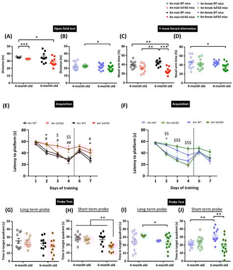 Memory deficits in 5xFAD mice at 6 months. Distance traveled in the open field test in (A) male and (B) female 5xFAD mice. Percentage of time spent in the novel arm in Y-maze forced alternation in (C) male and (D) female 5xFAD mice. Learning performance during the acquisition phase of the Morris water maze by the latency to locate the hidden platform in (E) male and (F) female 5xFAD mice. Reversal learning with the platform moved to the opposite quadrant was assessed on days 6–7. Time spent in the target quadrant during the long- and short-term probe in (G,H) male and (I,J) female 5xFAD mice. Data presented as mean ± S.E.M. Scatterplot shows individual value; * denotes comparison between 4-months old WT and 4-months old 5xFAD mice, ^ denotes comparison between 4-months old and 6-months old WT mice, $ denotes comparison between 4-months and 6-months old 5xFAD mice, # denotes comparison between 6-months old WT and 6-months old 5xFAD mice; *, ^, $, # p < 0.05, **, $$, ## p < 0.01, ***, $$$, p < 0.001.