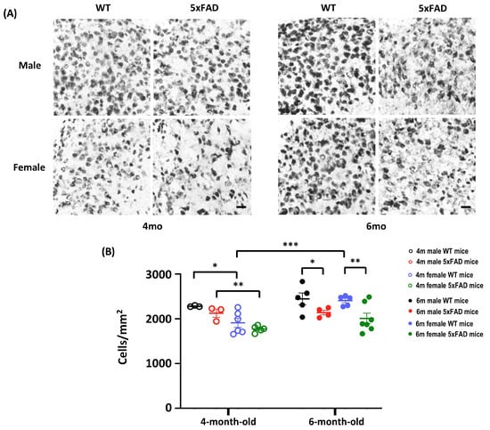 An in-depth analysis of neuron density in the subiculum revealed significant effects of Age, Sex, Genotype, and Age × Sex (All F(1,32) > 4.86, p < 0.05). A significant decrease in the number of NeuN+ cells was observed in both male and female 5xFAD mice when they reached 6-month old, implying the emergence of neuronal loss in 5xFAD at 6-month old (Figure 3A,B). Thus, the onset of neuronal loss in 5xFAD starts at 6 months, coinciding with the onset of behavioural impairment.