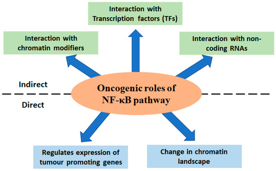 Graphical summary of the mode of activation of oncogenic pathways by NF-κB signalling cascade via direct (bottom panel) and indirect (upper panel) interaction/regulations of various macromolecular components and factors.