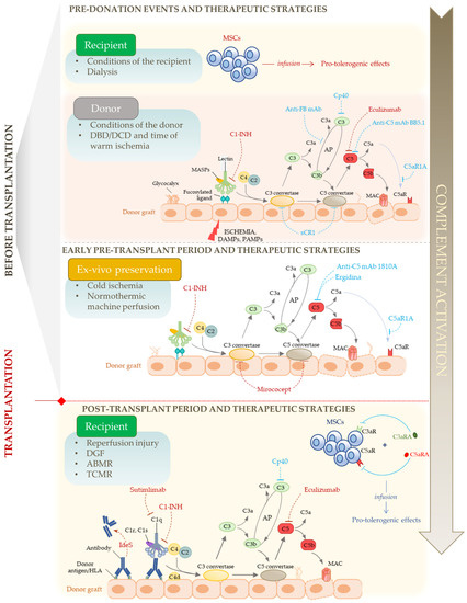 - Grafals, M.; Thurman, J.M. The Role of Complement in Organ Transplantation. Front. Immunol. 2019, 10, 2380. [Google Scholar] [CrossRef] [PubMed]