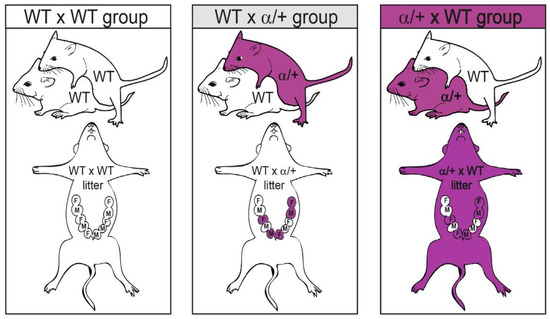 We used our three parental crosses (female x male: WT x WT, WT x α/+, and α/+ x WT, shown in Figure 1) to assess if littermate and/or maternal p110α deficiency affects the growth of WT conceptuses. In particular, by comparing to WT x WT, pregnancies generated by the WT x α/+ cross informed on the impact of adverse intrauterine conditions (presence of α/+ littermates in utero), whilst those created by mating α/+ females with WT mates informed on the combined effect of an adverse intrauterine and an adverse maternal environment [24,54]. Comparing WT x α/+ and α/+ x WT pregnancies allowed us to deduce the influence of an adverse maternal environment due to α/+ deficiency on WT conceptus growth. We found there was no effect of the parental cross on litter size or sex ratio and there was also no difference in the percentage of α/+ pups within the litter between WT x α/+ and α/+ x WT pregnancies (Supplementary Table S2).