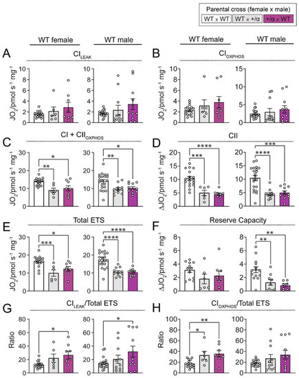 Placental mitochondrial bioenergetics of WT conceptuses in response to littermate and/or maternal p110α deficiency. Oxygen consumption in the placental LZ associated with CILEAK (A), CIOXPHOS (B), CI + CIIOXPHOS (C), CII (D), total ETS (E), reserve capacity (F), CILEAK/total ETS (G), and CIOXPHOS/total ETS (H) for females and males on day 18 of pregnancy. Data are from WT fetuses generated by WT x WT, WT x α/+, and α/+ x WT parental crosses (n = 1–2 fetuses/sex/dam with 5–12 dams/group) and are displayed as individual data points with mean ± S.E.M. Data were analysed by one-way ANOVA with Tukey post hoc pairwise comparisons (* p < 0.05, ** p < 0.01, *** p < 0.001, **** p < 0.0001, pairwise comparison).