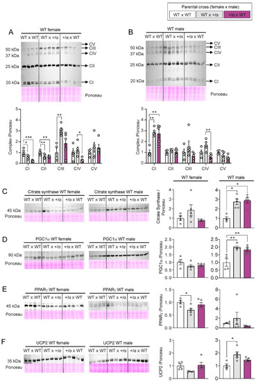 Protein abundance of mitochondrial complexes and key mitochondrial regulatory proteins in placental labyrinth of WT conceptuses in response to littermate and/or maternal p110α deficiency. Relative protein abundance of mitochondrial complexes in females (A) and males (B), as well as citrate synthase (C), PGC1α (D), PPARγ (E), and UCP2 (F) in females and males. Representative images from each antibody and Ponceau staining are included. Data are from 1 WT fetus per dam generated by WT x WT (n = 4), WT x α/+ (n = 5), and α/+ x WT (n = 5) parental crosses and are displayed as individual data points with mean ± S.E.M. Data were analysed by one-way ANOVA and Tukey post hoc pairwise comparisons (* p < 0.05, ** p < 0.01, *** p < 0.001, pairwise comparison).