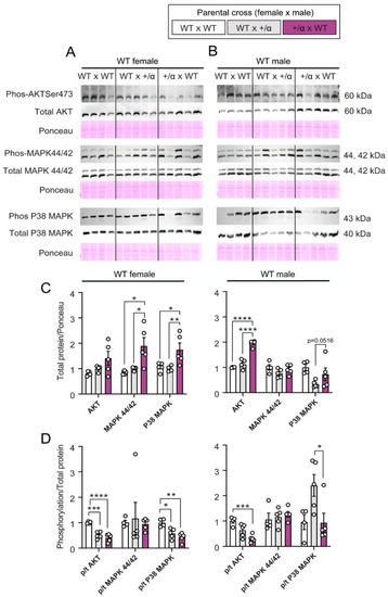 To further understand the mechanisms underlying the sex-specific changes in placental LZ profile in WT fetuses exposed to littermate and maternal p110α deficiency, we evaluated the expression of key growth and metabolic signalling proteins in our three pregnancy groups (WT x WT, WT x α/+, and α/+ x WT: Figure 5A,B). The selected proteins are known to regulate cellular bioenergetics by linking endocrine signals with mitochondrial function [1]. In WT female fetuses, the LZ abundance of total AKT was not affected, but the level of active phosphorylated AKT was decreased in both WT x α/+ and α/+ x WT pregnancies compared to WT x WT (Figure 5C,D). Meanwhile, WT males showed an increased abundance of total AKT in addition to reduced AKT activation only in α/+ x WT pregnancies compared to WT x WT and/or WT x α/+ (Figure 5C,D). WT females in α/+ x WT pregnancies exhibited increased total MAPK 44/42 abundance compared to those from WT x WT and WT x α/+ pregnancies, but no change was seen in the level of active phosphorylated protein. Furthermore, no changes in total or activated MAPK 44/42 were seen for the placental LZ of WT males, with similar values observed for all three pregnancy groups. Total p38 MAPK was also greater in the placental LZ of WT females from α/+ x WT pregnancies, but phosphorylated active levels were reduced in both WT x α/+ and α/+ x WT pregnancies compared to WT x WT. In contrast, in males, only changes in p38 MAPK were observed between the WT x α/+ and α/+ x WT pregnancy groups, with a tendency for increased total p38 MAPK, and a significant decrease in activated p38 MAPK. Together, these data suggest that growth and metabolic signalling proteins in the WT placenta are affected by both littermate and maternal p110α deficiency. Moreover, the nature of these effects depends on fetal sex.
