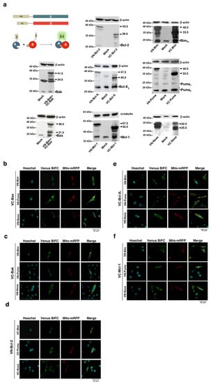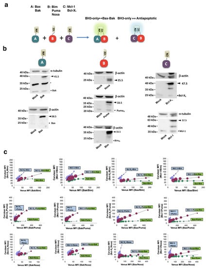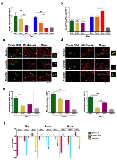 - Vela, L.; Gonzalo, O.; Naval, J.; Marzo, I. Direct Interaction of Bax and Bak Proteins with Bcl-2 Homology Domain 3 (BH3)-only Proteins in Living Cells Revealed by Fluorescence Complementation. J. Biol. Chem. 2013, 288, 4935–4946. [Google Scholar] [CrossRef] [PubMed]
