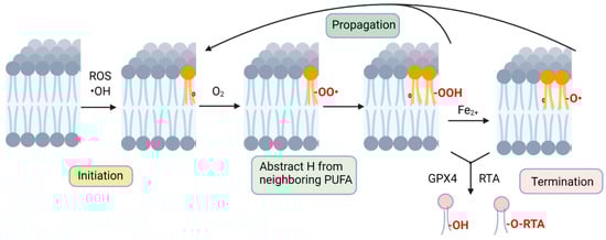 Non-enzymatic lipid peroxidation. Peroxidation is initiated by cellular ROS, where hydroxyl, alkoxyl or peroxyl radicals abstract a hydrogen from a PUFA acyl group (radical electrons denoted as red circle). A PUFA peroxide is formed by reacting with molecular oxygen and abstraction of a hydrogen from an adjacent membrane PUFA. Fenton chemistry contributes to further lipid radical formation, contributing to the chain reaction of lipid radicals attacking acyl groups on nearby unsaturated phospholipid molecules. Lipid peroxidation is terminated by actions of radical-trapping antioxidants or by reduction by catalyzed by glutathione peroxidase activity. Figure created with BioRender.com, accessed on 1 February 2023.