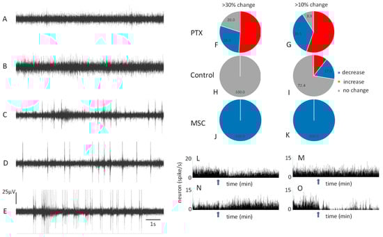 The average firing rate from both PTX and MSC experiments before the injections was 3.21 ± 0.98 spikes/s. The analysis of the neuronal firing rate over time using a Chi-squared test revealed no statistical significance between the behavior of neurons in the 10–15, 15–20, 20–25, 25–30, and 30–35 min intervals after PTX injection (Table S1) (the number of recorded neurons was 47: an average of four units per channel). Thus, to illustrate the effect, we chose the time interval of 15–20 min after PTX injection. We used two thresholds with a 30% and 10% difference in the activity of single neurons after vs. before injection (Figure 1F,G). We observed an increase in the activity of 51% of the recorded neurons and a decrease in 29% of the neurons for the 30% threshold. We observed an increase in the activity of 56% of the recorded neurons and a decrease in 36% for the 10% threshold. Control injections produced much lower changes (Figure 1H,I). MSC decreased the neuronal activity of all single neurons (Figure 1J,K) by 71.5% on average (the number of recorded neurons was 45). Figure 1L,M illustrates examples of a single neuron’s behavior: increase (Figure 1L), no change (Figure 1M), or decrease (Figure 1N) of the firing rate after PTX injection. Figure 1O shows an example of the effect of MCS on a single neuron.