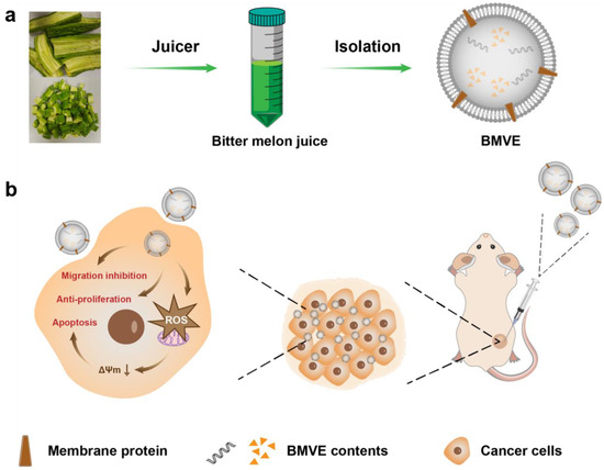 A schematic illustration of BMVE isolation and corresponding in vivo antitumor activity. (a) BMVE was isolated from bitter melon juice by centrifugation. (b) BMVE is injected intratumorally and internalized by tumor cells, which can exert antitumor effects through anti-proliferation, migration inhibition and induction of apoptosis.