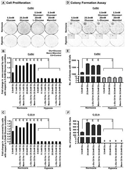 Tumour cells show efficient adaptation to the hyper-osmotic stress generating property of high glucose and significantly proliferate in normoxia. CaSki/C-33A cervical cancer cells were cultured for 96 h in NG, HG and HG-HO, with or without hypoxia stimulation. (A–C) Tumour cell proliferation, (D–F) Colony-forming analyses were performed, and all comparisons were made with NG condition unless otherwise indicated. Statistical significance is represented by p values: *** p ≤ 0.001. See related Supplementary Figure S3A.