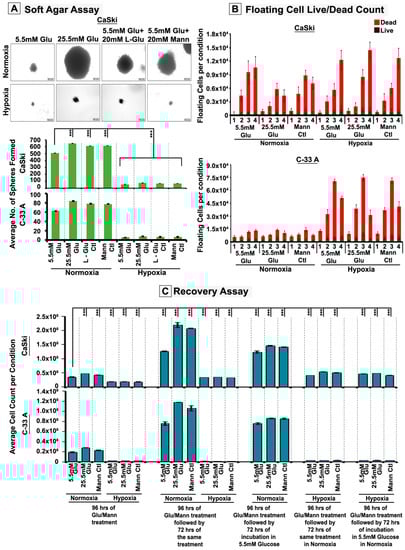 Acute hypoxia attenuates high glucose hyper-osmotic stress pro-proliferative mechanoadaptive effects and generates dormant tumour cell phenotypes, which can recover upon intercepting normoxia. (A) CaSki/C-33A cervical cancer cells were subjected to soft agar-based anchorage-independent NG, HG and HG-HO conditions, with or without hypoxia stimulation. The number of spheroids formed showed substrate-independent self-renewable capacity of a single cell. (B) CaSki/C-33A cells showed many dead floating cells in NG, HG and HG-HO hypoxic conditions. (C) CaSki/C-33A cervical cancer cells were cultured as described for panel (A). (i) The normoxic HG and HG-HO stress conditions were then subjected to NG for the next 72 h, and cell proliferation was determined to estimate the effect of glucose normalization on tumour growth. (ii) Tumour cells, initially grown in NG, HG and HG-HO hypoxic conditions were subsequently cultured in normoxia for the next 72 h. (iii) Hypoxia-grown cells were reversed to NG normoxic conditions; cell proliferation was determined in (ii) and (iii) to estimate the renewability/relapse of residual growth in hypoxia upon intercepting conducive normoxic NG, HG and HG-HO conditions. Statistical significance is represented by p values: *** p ≤ 0.001.See related Supplementary Figure S3B,C.