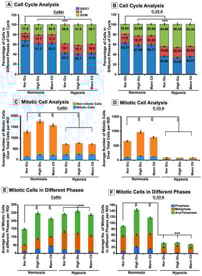 Acute hypoxia attenuates high-glucose hyper-osmotic stress pro-proliferative mechanoadaptive effects by promoting mitotic M-phase arrest. CaSki/C-33A cervical cancer cells were cultured for 96 h in NG, HG and HG-HO with or without hypoxia stimulation. (A,B) FACS-assisted cell cycle analysis was performed. (C,D) Average mitotic cell counts over the total cell number per ROI were obtained to estimate whether more cells were stalled in mitosis over total cells in each condition. (E,F) The images of mitotic cells per ROI were further scored into different mitotic (pro, meta and ana/telo) phases manually to estimate whether the distribution of mitotic cells in these phases could correlate with total cell numbers or not. Statistical significance is represented by p values: *** p ≤ 0.001.