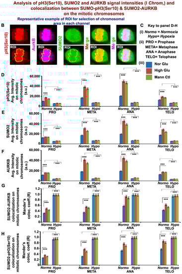 Acute hypoxia restricts the localization of SUMO2, AURKB and pH3(Ser10) on the mitotic chromosomes of the tumour cells. CaSki/C-33A cervical cancer cells were cultured for 96 h in NG, HG and HG-HO, with or without hypoxia stimulation. (A) Cells were immunostained with SUMO2, AURKB and pH3(Ser10). Coloured arrows in the middle panel indicate an example of differences in expression between normoxia and hypoxia. (B) An example of free-hand ROI selection for analysis of protein intensities and colocalization. (C–F) The fluorescence intensity (I) of each protein on mitotic chromosomes is indicated in the panel. (G,H) The extent of colocalization of SUMO2 with AURKB and pH3(Ser10) is expressed as Mander’s coefficient of colocalization (R). Statistical significance is represented by p values: *** p ≤ 0.001. In addition, see related Supplementary Figures S5 and S6.