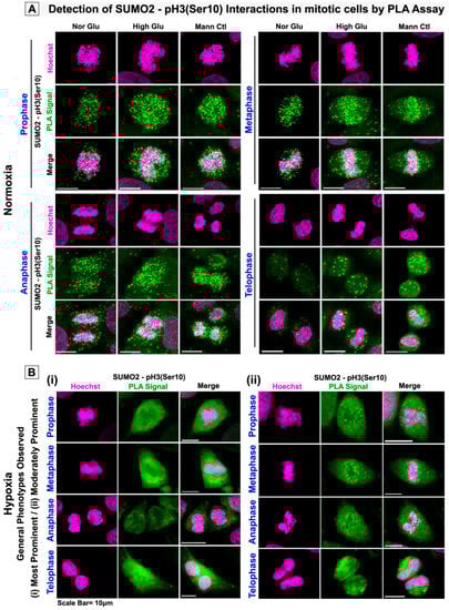 The following supporting information can be downloaded at: https://www.mdpi.com/article/10.3390/cells12060825/s1, Supplementary Information Files: Supplementary Information Files comprising Supplementary Table S1 (Additional File S1) and Supplementary Figures and Methods (Additional File S2) accompany this manuscript and are available online. Supplementary Table S1: List of SUMO2 conjugated mitosis regulatory proteins obtained from Eifler et al., 2015 and MsigDB data; Supplementary Figure S1: General experimental set-up for all experiments; Supplementary Figure S2: HIF1a, a known hypoxia marker, showed stable expression by 48 h of treatment with 150 µM Cobalt chloride in the tumour cell culture medium; Supplementary Figure S3: Representative images of confluency, colony formation and soft agar assay in C-33A cervical cancer cells. Supplementary Figure S4: Cell fate analysis of tumour cells in normal, high glucose and hyperosmotic equivalent conditions under normoxia and hypoxia; Supplementary Figure S5: AURKB localization to the midbody was less in acute hypoxia-exposed tumour cells; Supplementary Figure S6: pH3(Ser10) is prominently colocalized with SUMO2 in the cytoplasm of acute hypoxia-treated cancer cells in contrast to a nuclear colocalization in normoxia; Supplementary Figure S7: Protein-Protein interaction detection assay, the proximity ligation assay (PLA), showed a cytoplasmic signal of  pH3(Ser10) and SUMO2 in acute hypoxia treated cancer cells, irrespective of high glucose/hyperosmotic conditions; Supplementary Figure S8: Direct FRET between pH3(Ser10) and SUMO2 confirms cytoplasmic sequestration of SUMOylated pH3(Ser10) in acute hypoxia; Supplementary Figure S9: The details of the US Biomax uterine cervical cancer tissue array used to generate data are shown in main Figure 7 and Supplementary Figures S10–S15; Supplementary Figure S10: Cytoplasmic colocalization of pH3(Ser10) and SUMO2 is observed in HIF1a high regions of grade I cervical squamous cell carcinoma tissues; Supplementary Figure S11: Significant cytoplasmic colocalization of pH3(Ser10) and SUMO2 is observed in HIF1a high regions of grade III cervical squamous cell carcinoma tissues,  which are negative for the HPV16; Supplementary Figure S12: Significant cytoplasmic colocalization of pH3(Ser10) and SUMO2 is observed in HIF1a high regions of grade III cervical squamous cell carcinoma tissues,  which are also positive for HPV16; Supplementary Figure S13: Cytoplasmic colocalization of pH3(Ser10) and SUMO2 is observed in HIF1a high regions of Grade III uterine adenocarcinoma patient tissues; Supplementary Figure S14: Cytoplasmic colocalization of pH3(Ser10) and SUMO2 is observed in HIF1a high regions of brain, breast and colon cancer patient tissues; Supplementary Figure S15: Cytoplasmic colocalization of pH3(Ser10) and SUMO2 is observed in HIF1a high regions of pancreatic, skeletal muscle, liver, skin and stomach cancer patient tissues; Supplementary Figure S16: Molecular dynamics simulations predict a stable conjugation of SUMO2 to pH3(Ser10) in the disordered tail region of the protein; Supplementary Figure S17: siRNA-mediated knockdown of SENP7 resulted in increased nuclear localization of pH3(Ser10) in tumour cells exposed to hypoxic conditions; Supplementary Figure S18: siRNA-mediated knockdown of SENP1 resulted in decreased nuclear localization of pH3(Ser10) in normoxic normal glucose conditions, whereas the reverse was observed with SENP7 knockdown in tumour cells; Supplementary Figure S19: SUMO isoforms 1, 3, and 4 can localize to tumour cells’ nuclei in both hypoxic and normoxic conditions; Supplementary Figure S20: The prominent nuclear localization of AURKB observed in normoxia was abrogated in the acute hypoxic conditions, but no LLPS phenotype was observed; Supplementary Figure S21: Momordin Ic dose titration by MTT assay showed that the normal cells were unaffected up to a concentration of 25 µM; Supplementary Figure S22: Under both hypoxia and normoxia, high glucose conditions showed mitotic cell cycle arrest, in tumour cells, upon treatment with Momordin Ic; Supplementary Figure S23: Under both hypoxia and normoxia, high glucose hyperosmotic stress conditions showed mitotic cell cycle arrest in tumour cells upon treatment with Momordin Ic; Supplementary Figure S24: MTT assay showed the viability of normal cells was not affected by the individual or combined doses of Momordin Ic and Gallic Acid drug treatments in this investigation