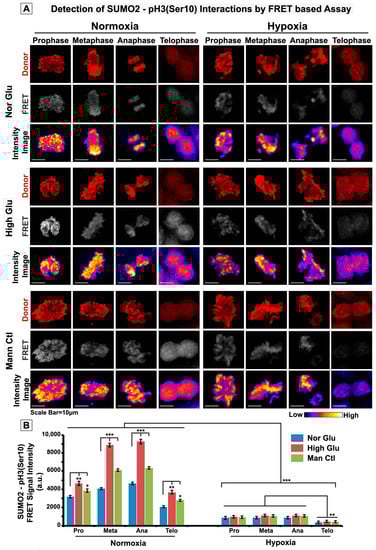 Direct FRET between pH3(Ser10) and SUMO2 confirms cytoplasmic sequestration of SUMOylated pH3(Ser10) in acute hypoxia exposed mitotic cells. CaSki cervical cancer cells were cultured in the general experimental set-up for 96 h. (A,B) Cells were immunostained with pH3(Ser10) and SUMO2 primary antibodies and were further tagged with Cy3 and Alexa flour 647 conjugated secondary antibodies, respectively, as Cy3-Alexafluor 647 are established FRET compatible donor–acceptor pairs. Analysis showed enhanced chromosomal localization of SUMO2-pH3(Ser10) FRET signal in both HG and HG-HO conditions vs NG in normoxia. On the contrary, the FRET signal was prominent in the cytoplasm of hypoxia-treated cells. Statistical significance is represented by p values: * p ≤ 0.05, ** p ≤ 0.01 and *** p ≤ 0.001. See related Supplementary Figure S8 for correlated results in acute hypoxia-exposed non-mitotic tumour cells.