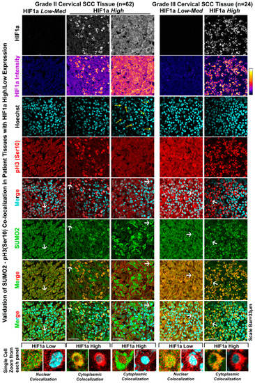High HIF1a-expressing regions in cancer tissues validate the role of hypoxia in cytoplasmic sequestration of SUMO2-pH3(Ser10). Grade II and III cervical squamous cell carcinoma tissues showed hypoxic (HIF1a high) and normoxic (HIF1a low–medium) areas within the same block. Cytoplasmic localization of pH3(Ser10) and SUMO2 was observed in HIF1a-positive cells. On the contrary, HIF1a low to medium expressing regions showed appreciable nuclear colocalization. White arrowheads indicate the single cell with zoomed images in the lowermost panel. Yellow arrows indicate the condensed chromatin associated with apoptosis in acute hypoxic regions. See related Supplementary Figures S10–S15 for extended validation on uterine cervical cancer grade I, grade III and brain, breast colon, pancreatic, skeletal muscle, liver, and stomach cancer tissues.