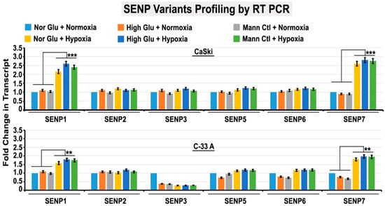 Acute hypoxia upregulates SUMOylation regulatory proteins SENP1 and SENP7. Tumour cells were subjected to the basic treatment conditions for 96 h. Real-Time-PCR-based data showed a significant upregulation in the transcript of SENP1 and SENP7 in acute hypoxia-induced conditions vs normoxia. All comparisons were made with NG normoxic condition unless indicated in the graph. Statistical significance is represented by p values: ** p ≤ 0.01 and *** p ≤ 0.001.