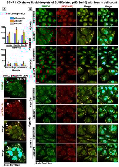 Since SUMO2 conjugation and de-conjugation (de-SUMOylation) are regulated by sentrin proteases, we profiled the transcripts of SENP isoforms. We found that SENP1 and SENP7 were significantly high in acute hypoxia (Figure 9). Subsequent RNA interference studies showed that SENP7 downregulation enhanced proliferation in both hypoxia and normoxia, supported by an observed increase in cell counts in SENP7 downregulation, and the reverse was observed when SENP1 was downregulated (Figure 10A and Figure S17). This suggests that SENP7 does not support survival, while SENP1 does. Interestingly, SENP1 downregulation generated SUMO2-pH3(Ser10) LLPS even in normoxia, and in hypoxia, the LLPS-like phenotype intensified (Figure 10B and Figure S18). SENP1 downregulation can prevent SUMO2 substrate degradation and promote its abnormal accumulation. These observations again suggest that SENP1 is pro-survival and is not involved in LLPS generation in acute hypoxia [,,,,,,]. It further indicates that SENP7 may be involved in LLPS generation, which is restricted by SENP1, due to which a few dormant stem-like tumour cells resist acute hypoxia challenge. SENP7’s polySUMO chain length shortening activity is structurally specific for SUMO2-conjugated substrates []. Therefore, in hypoxia with elevated levels of SENP7, the SUMO2 nuclear signal was less vs other isoforms (although some punctate cytoplasmic signals were observed for other isoforms as well in hypoxic vs normoxic conditions) (Supplementary Figure S19).