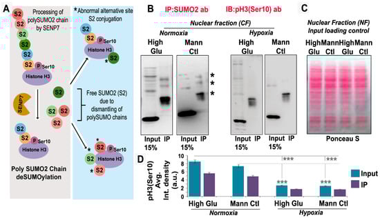 Further, the SUMO2 substrate, such as AURKB, was not associated with a significant LLPS phenotype in hypoxia, although its nuclear trafficking was inhibited (Supplementary Figure S20). Therefore, LLPS formation is very substrate-specific to certain SUMO targets only []. SENP7 is predominantly involved in the deSUMOylation of polySUMO chains, causing shortening in the polySUMO2 chain conjugated to its substrate. The SUMO2 freed from the polySUMO chain can further bind to the same substrate at other conducive sites via the activity of ligases (Figure 11A, diagrammatic representation of SENP7 action). Thus, the nature of SUMOylation and positional location of SUMOylation cumulatively determine the substrate’s physical state, solubility and functionality in a context-dependent manner. Therefore, polySUMO chain deSUMOylating SENPs can lead to the loss of SUMO substrate functions or vice versa. To test abnormal SUMO processing of pH3(Ser10), we needed to perform the immunoprecipitation experiments either from the adherent cell lysates or the cytoplasmic fraction, which were technically challenging for the hypoxic conditions due to the formation of LLPS. However, we extracted the nuclear lysates from tumour cells in HG and HG-HO hypoxic and normoxic conditions, and via co-immunoprecipitation with the SUMO2 antibody, profiled the SUMOylation states of pH3(Ser10) that managed to enter the nucleus (Figure 11B). The input showed relatively less levels of the pH3(Ser10) pool in the hypoxic nuclei. The higher molecular weight bands of SUMOylated pH3(Ser10) were missing in the immunoprecipitated hypoxic samples (Figure 11B, indicated by asterisks). In addition, the SUMOylated pH3(Ser10) levels were less (Figure 11C). This suggests that a pool of SUMOylated pH3(Ser10) that managed to enter the hypoxic nuclei was majorly differentially modified by SUMO2 and, thereby, may not be efficient in association with chromosomes, as documented in Figure 4, Figure 5 and Figure 6. This is correlated with the observation that depletion of SENP7 allows more SUMOylated pH3(Ser10) to enter the nuclei and thereby promotes proliferation (Supplementary Figure S17).