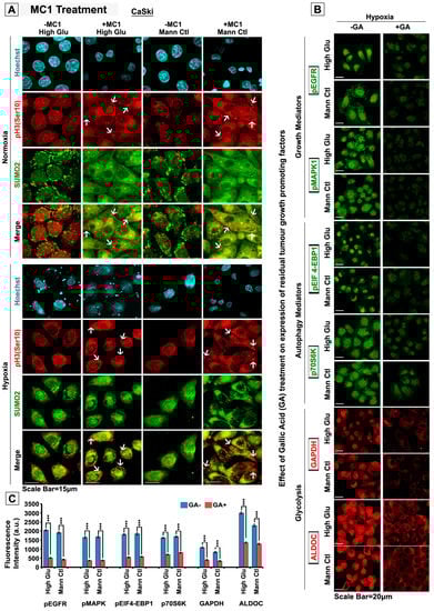 Momordin Ic (MC), an SENP1 inhibitor, can hijack mechanoadaptation of normoxic high-glucose hyper-osmotic tumour cells by promoting abnormal SUMOylation of pH3(Ser10). Cells were subjected to the basic treatment conditions for 96 h, followed by treatment with 25 µM Momordin Ic for 6, 12, 24 and 48 h.(A) Confocal images show massive cytoplasmic colocalization of SUMO2-pH3(Ser 10) in normoxic experimental conditions vs untreated conditions (see white arrows). In hypoxia, the treatment enhanced cytoplasmic sequestration of SUMO2-pH3(Ser10). (B,C) In order to more robustly eliminate the residual growth in hypoxia, the tumour cells were treated with 100 µM of Gallic Acid (GA), post 96 h of treatment in the standard experimental conditions. Gallic-Acid-treated cells were immuno-probed for key survival players such as pEGFR(1173), pMAPK1, pEIF-4EBP1, P70S6K, GAPDH and ALDOC. Confocal image analysis showed reduced levels of probed molecules in GA treated vs untreated conditions. Statistical significance is represented by p values: *** p ≤ 0.001. See related Supplementary Figures S22 and S23.