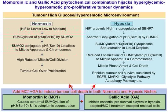 Momordin Ic (MC) and Gallic Acid phytochemical combination can hijack tumour cells’ pro-proliferative mechanoadaptation to high-glucose hyper-osmotic stress. In summary, it was found that in the normoxic HG microenvironment, tumour cells proliferate extensively as a biophysical adaptation to high-glucose hyper-osmotic stress (HG-HO), which predominantly involves an appropriate SUMOylation of pH3(Ser10). Acute hypoxia triggers the accumulation of abnormally SUMOylated pH3(Ser10) due to the upregulated activity of SENP7 that leads to mitotic arrest. Inhibition of SENP1 via Momordin Ic (MC) can cause similar M-phase arrest in proliferating normoxic cells, irrespective of HG and HG-HO pro-proliferative stress. The M-phase arrested population could be cleared by suppressing residual growth signalling via Gallic Acid (GA) treatment. Both MC and GA are enriched in Momordica charantia.
