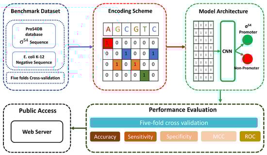 To overcome these limitations, we propose a CNN-based model “iProm-Sigma54” to identify promoter sequences. First, we built a benchmark dataset and performed a one-hot feature-encoding scheme to extract the feature representation vector. We used a variety of assessment criteria that are often applied in bioinformatics to evaluate the model’s performance. The Matthews correlation coefficient (MCC) and the accuracy, sensitivity, and specificity were computed. To further examine the model, we used five-fold cross-validation assessment measures. Additionally, the receiver operating characteristic (ROC) curve was computed. And at last, a web server was created in accordance with the proposed model. Figure 1 shows the flow diagram of the proposed model.