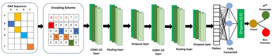 The process of translating genetic data encoded in DNA into a matching RNA molecule is called transcription. RNA polymerase, an enzyme, reads the DNA code during transcription to create messenger RNA (mRNA), a single-stranded RNA molecule that retains the genetic material to the ribosome for protein synthesis. With the exception of the change of uracil for thymine in the RNA molecule, the mRNA molecule is a complimentary copy of the DNA sequence. Transcription is the initial step in gene expression and an important mechanism in regulating cellular activity [1]. A promoter is a DNA sequence that regulates transcription initiation throughout the transcription process. The promoter is the site on the DNA where the RNA polymerase enzyme attaches and begins the transcription process. The promoter sequence serves as a binding site for RNA polymerase and other regulatory proteins that govern transcription start, rate, and termination. The existence of unique promoter sequences enables gene expression regulation, allowing cells to react to various stimuli and govern the creation of certain RNA and protein products. Different kinds of promoters may result in varying degrees of gene expression and can decide whether a gene is tissue-specific or inducible. As a result, the promoter is an essential component in the control of gene expression. The sigma factor of RNA holoenzymes is essential for recognition and binding of promoter regions during gene transcription in prokaryotes [2]. As a result, prokaryotic promoters are classified corresponding to () factors. Seven known factors exist, such as , , , , , , and, and every () factor serves a distinct purpose. The factor can identify the consensus sequences TGCATTA and CTTGGCACTGA, which are around −12 base pairs (bp) and −24 bp upstream of the transcription start site (TSS), respectively. promoters are involved in a variety of supporting activities and ecologically responsible practices [2], such as the extraction of chemotaxis transducers, construction of motility organs [3], nitrogen fixation [4], arginine catabolism [5], alginate biosynthesis [6], and flagella [7]. Therefore, understanding the procedure of gene transcription and establishing gene expression networks requires knowledge of promoters. As a result, it is crucial to identify binding promoters for a specific factor for future research into gene regulation and functional genomics [8]. Since promoters are essential for gene transcription, precise identification of promoter locations has become essential for understanding gene expression, interpreting patterns, and building genetic regulatory networks. Several biological investigations have been carried out to determine promoters, including mutational analyses [9,10] and immunoprecipitation tests [11]. As the investigational discovery of promoters is costly and time taking, the computerized identification of factor promoters has emerged as an important topic in bioinformatics.