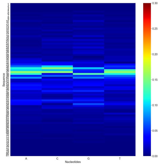 For a more thorough examination, we investigated the effect of alternating nucleotides at each location on the performance score. Computational mutation scanning was conducted for each promoter sequence in the test set to determine whether changing each base of the input subsequence affected the results. Sequences with a length of 81 bp were considered and nucleotides at any position in the sequence were mutated individually. In addition, the absolute differences between the original and mutated sequence predictions were calculated and stored. The average expected score for all mutations was determined for all the sequences. Finally, the heat map shown in Figure 4 was generated using the average predicted score. As seen in the heat map, mutations in the middle of the sequence have a greater impact on the “iProm-Sigma54” CNN estimation than mutations in the beginning and ending nucleotides of the sequence, respectively. The results revealed that nucleotide changes had little impact on the outcome of “iProm-Sigma54” CNN recognition.