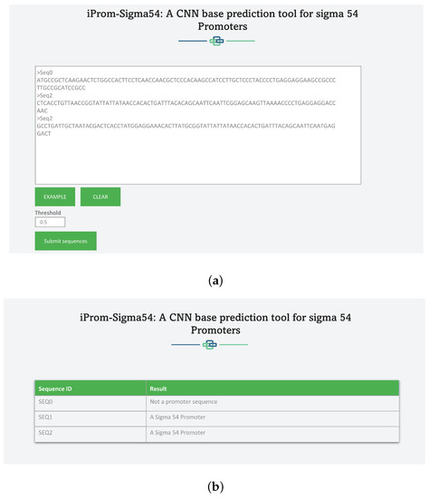 Webserver of iProm-Sigma54: (a) Adding Sequences for Prediction to Web server. The Query Sequence should be in Fasta format and must contain only A, C, G, T. (b): Predictor Output for Query Sequences. Table shows output for each query sequence.