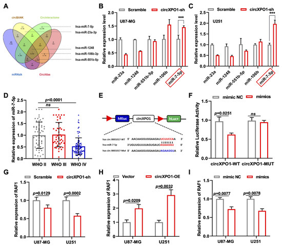 Identification of miR-7-5p as circXPO1 target. (A) Venn diagram exhibits the screening of circXPO1-targeted miRNA candidates. (B,C) The miR-7-5p was selected due to its rise in levels with the circXPO1 knockdown. “***” indicates p < 0.001. (D) Decreased expression of miR-7-5p with tumor grade was demonstrated with CGGA data. (E) Putative binding site of miR-7-5p on circXPO1. (F) Dual-luciferase reporter assays verified the direct interaction between circXPO1 and miR-7-5p. (G–I) QPCR analysis in treated glioma cells identified RAF1 as the downstream gene of circXPO1/miR-7-5p axis.